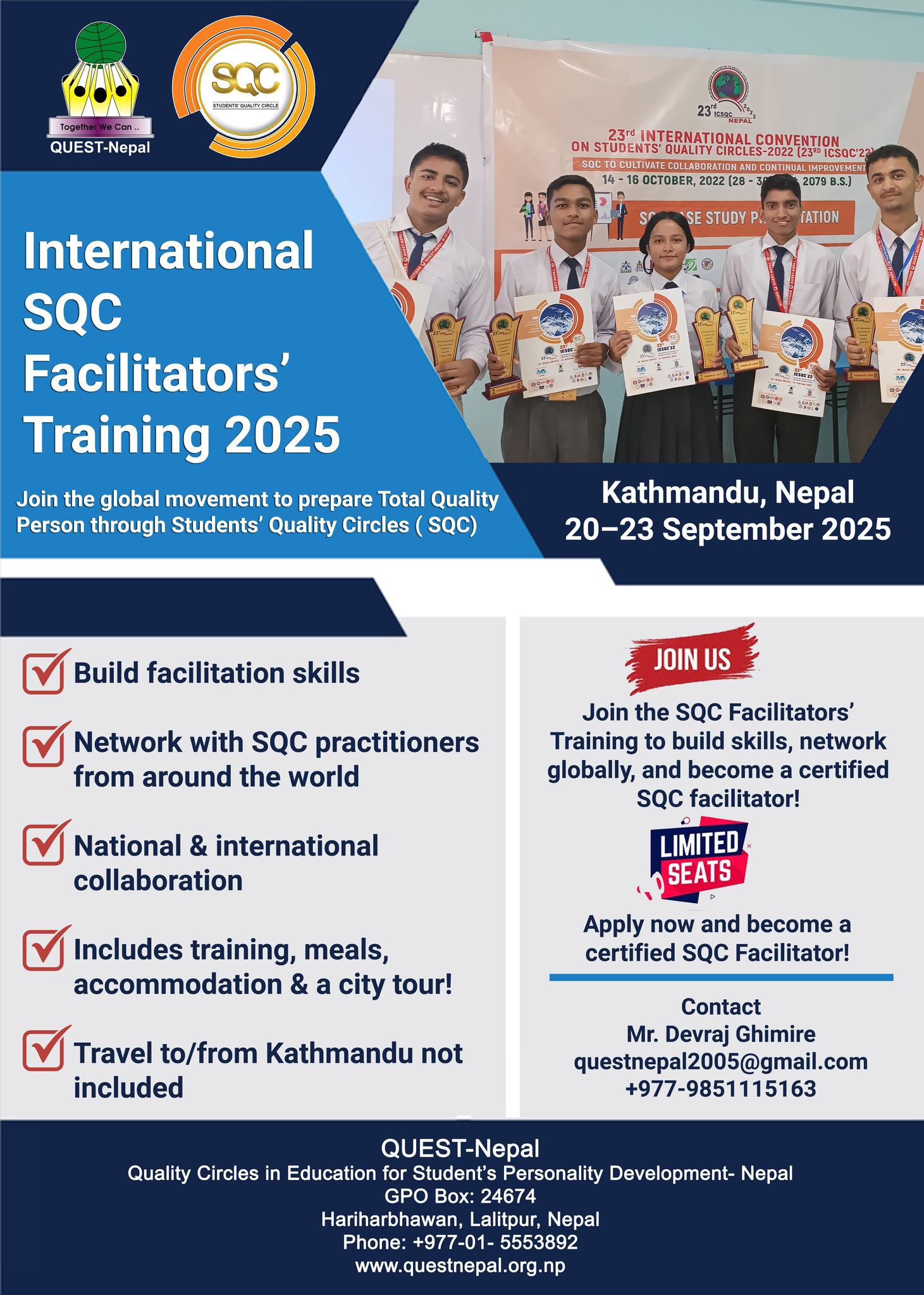 The International SQC Facilitators’ Training 2025 is set to take place from 20–23 September 2025 in Kathmandu, Nepal, organized by QUEST-Nepal. This four-day program offers a unique opportunity for educators, trainers, and quality leaders to become certified facilitators of Students’ Quality Circles (SQC) and contribute to a global movement dedicated to nurturing both smartness and goodness in education.